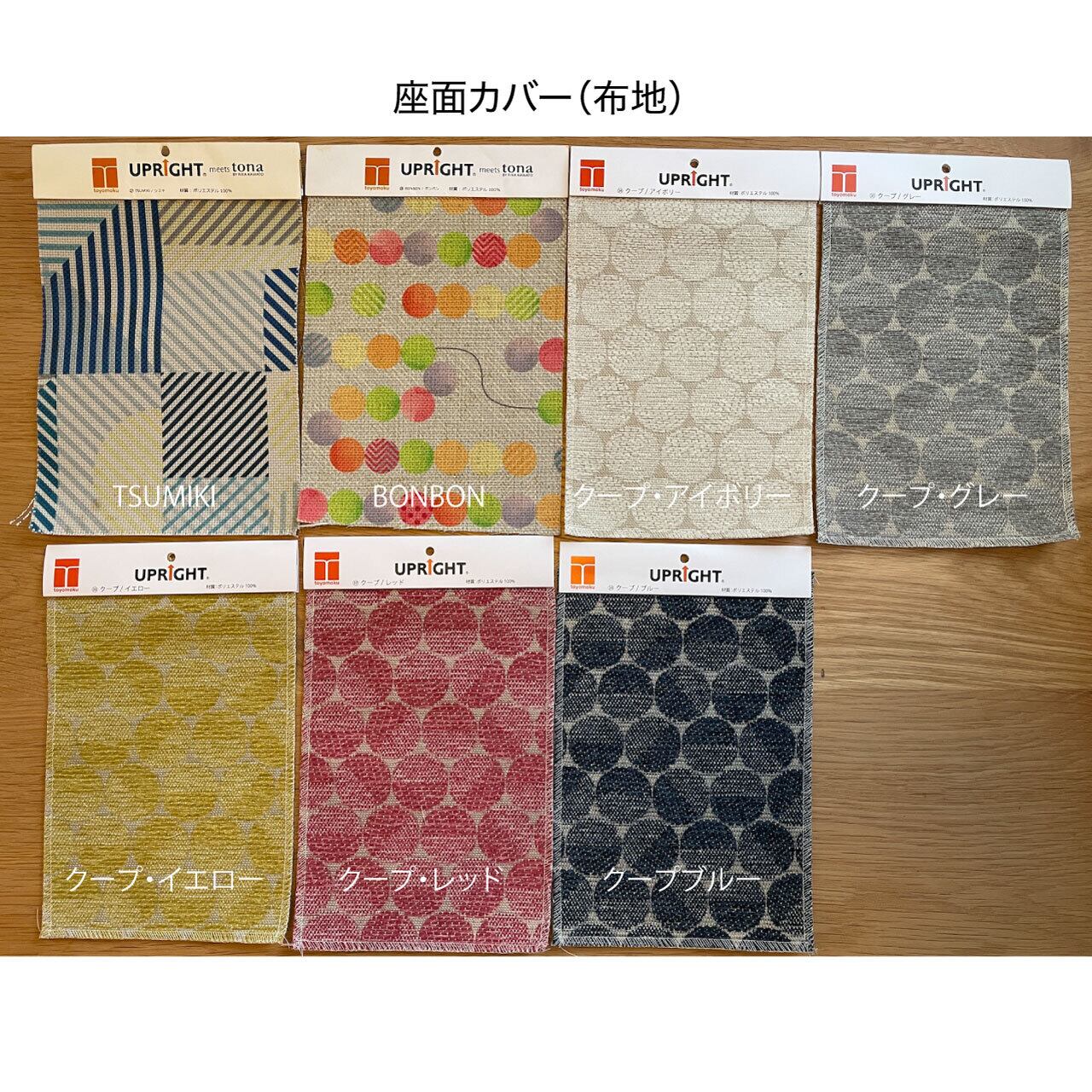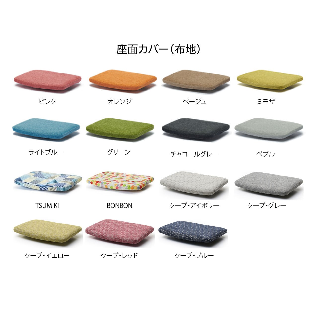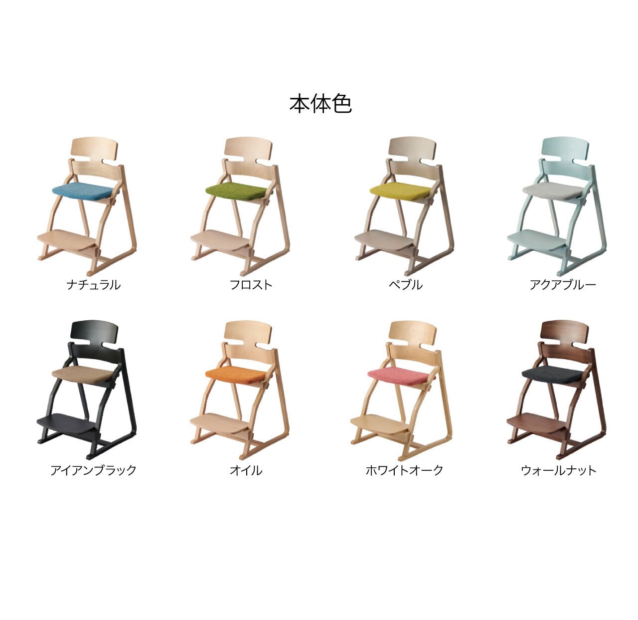 本体の色は全部で8色(‡仕上げによって価格が変わりますオイル+3,300円、ホワイトオーク/ウォールナット+11,000-円)。座面カバー全25種類と自由に組み合わせることができます。